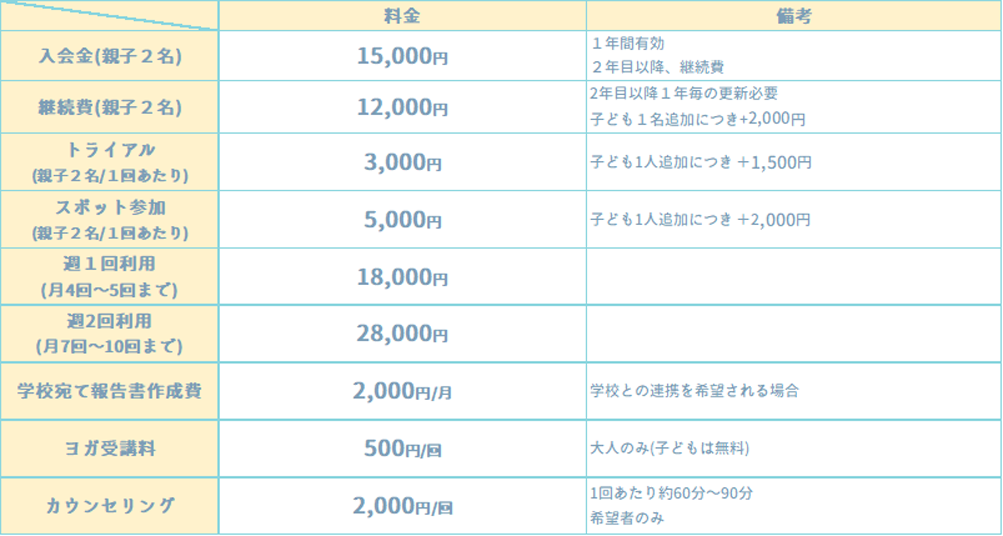 〇カウンセリング、ヨガに関わる費用については、利用された月にお月謝とまとめてお納めください。